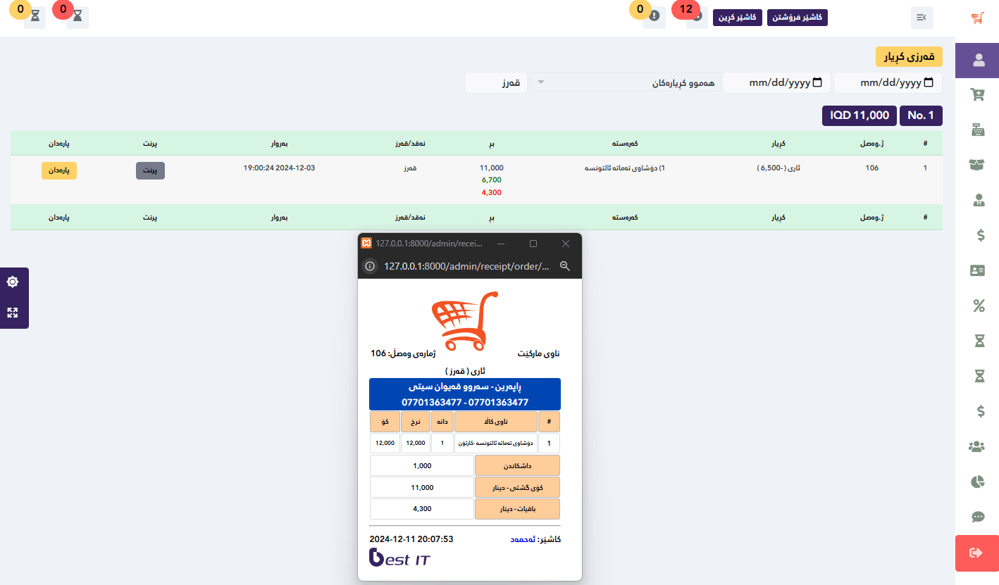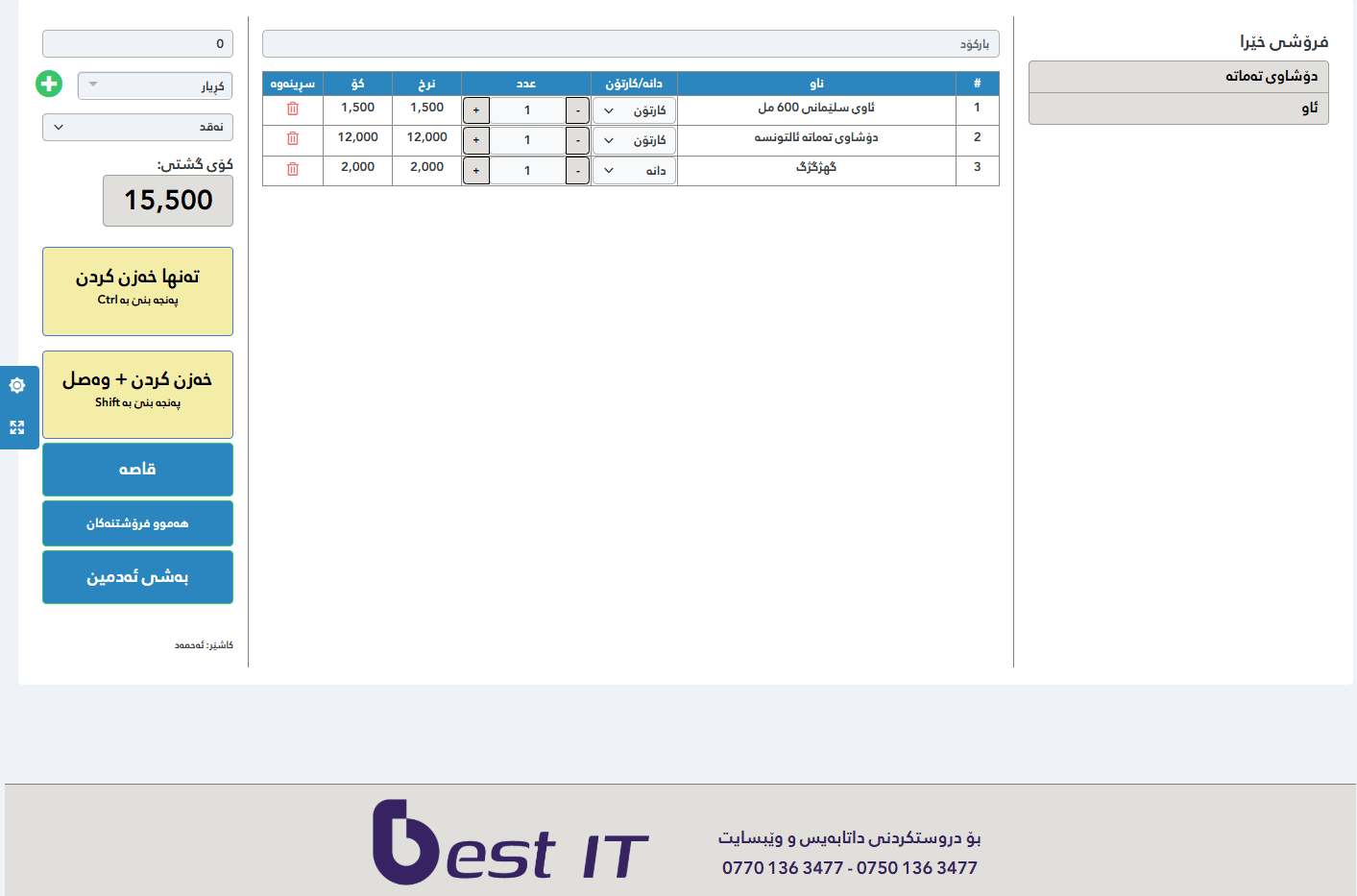 ا 🛒🍓🛒🧺🛒🍪 ا بەشداری کردنی هەرزان بازاری کەتان لە سیستەمی مارکێتی بێست ئای تی تۆش ئەگەر سیستەمت پیویستە بۆ مارکێتەکەت یاخود کۆگاکەت ئەوا پەیوەندیمان پێوە بکە جیاوازی ئەم سیستەمە چییە؟ 🤷🏻♂️ ✅ئاسانی لە بەکار هێنان تەنها بە دروستکردنی ئەکاونتێک هەموو خزمەتگوزارێکان بەردەست دەبیت. ✅زانیارێکانت پارێزراون ئەگەر کۆمپیوتەرەکەشت بسوتێ و لە کاربکەوێت. ✅دەتوانیت لە ڕێی مۆ بایلەکەتەوە چاودێری مارکێتەکەت بکەیت لە هەر شوێنێک بی، قازانج و وردوکارێکان ببینی. ✅پاڵپشتی بەردوام بۆ هەتا هەتایە ✅2 هەفتەی یەکەم خۆراییە ئەگەر بە دڵت نەبوو بەکاری ناهێنی. ✅فێرکاری تەواو بۆ سیستەمەکە. ✅هەرزانی نرخ. ✅ کوالیتی بەرز و خیرایی لە کاتی بەکارهێناندا. تایبەتمەندی سیستەمەکە : ⭐ زانین و پارەدانی قەرزی کڕیار و فرۆشیار بە ئاسانترین شێوە. ⭐خۆی پێت دەلێت چ کاڵایەکت بەسەرچووە و یان نزیکە لە بەسەرچوون. ⭐پێت دەڵێت چ کاڵایەکت تەواو بووە یان نزیکە لە تەواو بوون بۆ ئەوەی زوو داوای بکەیت. ⭐زۆرترین قازانج لە چ کاڵایەکە لە مانگێکدا یاخود لە بەروارێکی دیاریکراودا. ⭐ زۆرترین فرۆش لە چ کاڵایەکە، واتە چ کالایەک خواستی زیاتر لەسەرە. ⭐ خەرجی رۆژانە. ⭐ مەعاشی کارمەند. ⭐ بەشی تەلەف ئەگەر کاڵایەکت بەسەرچوو یان تێکچوو. ⭐ تەنها بە کلیکیک دەتوانی پرنتی بارکۆدی کاڵا بۆ سەر کاڵاکە بکەی ئەگەر بارکۆدی نەبوو. ⭐ تەنها بە کلیکێک دەتوانی پرنتی ناو و نرخ بۆ سەر رەفە بکەیت. ⭐ تەنها بە کلیکیک دەتوانیت پرنتی ناوو نرخی کاڵاکە بکەیت بە گەورەیی و ئەگەر داشکاندنیشی بۆ کرابوو نرخی پێش داشکاندن و دوای داشکاندنیش دەنووسێت. ⭐ کەشف حساب. ⭐ نرخی خەمڵێنراوی کاڵاکەت لەناو مارکێتەکادە چەنە. ⭐ چەندین تایبەتمەندی وردی کەی تیایە. تۆش ئەگەر وێبسایت یاخود سیستەمت پێوەستە بۆ بزنسەکەت ئەوا ئێمە هەڵبژێرە بە باشترین کوالیتی و بە هەرزانترین نرخ بۆت دروست دەکەین 📍ناونیشان: سلێمانی - دوو سایدی چوارتای کۆن - سەروو ئامادەیی پیرەمێرد 07701363477 واتساپ 07501363477 🔸بێست ئای تی بۆ دروستکردن سیستەم و داتابەیس و وێبسایت #بێست_ئایتی #سیستەم #داتابەیس #سیستەمی_کاشێر #وێبسایت #مارکێت